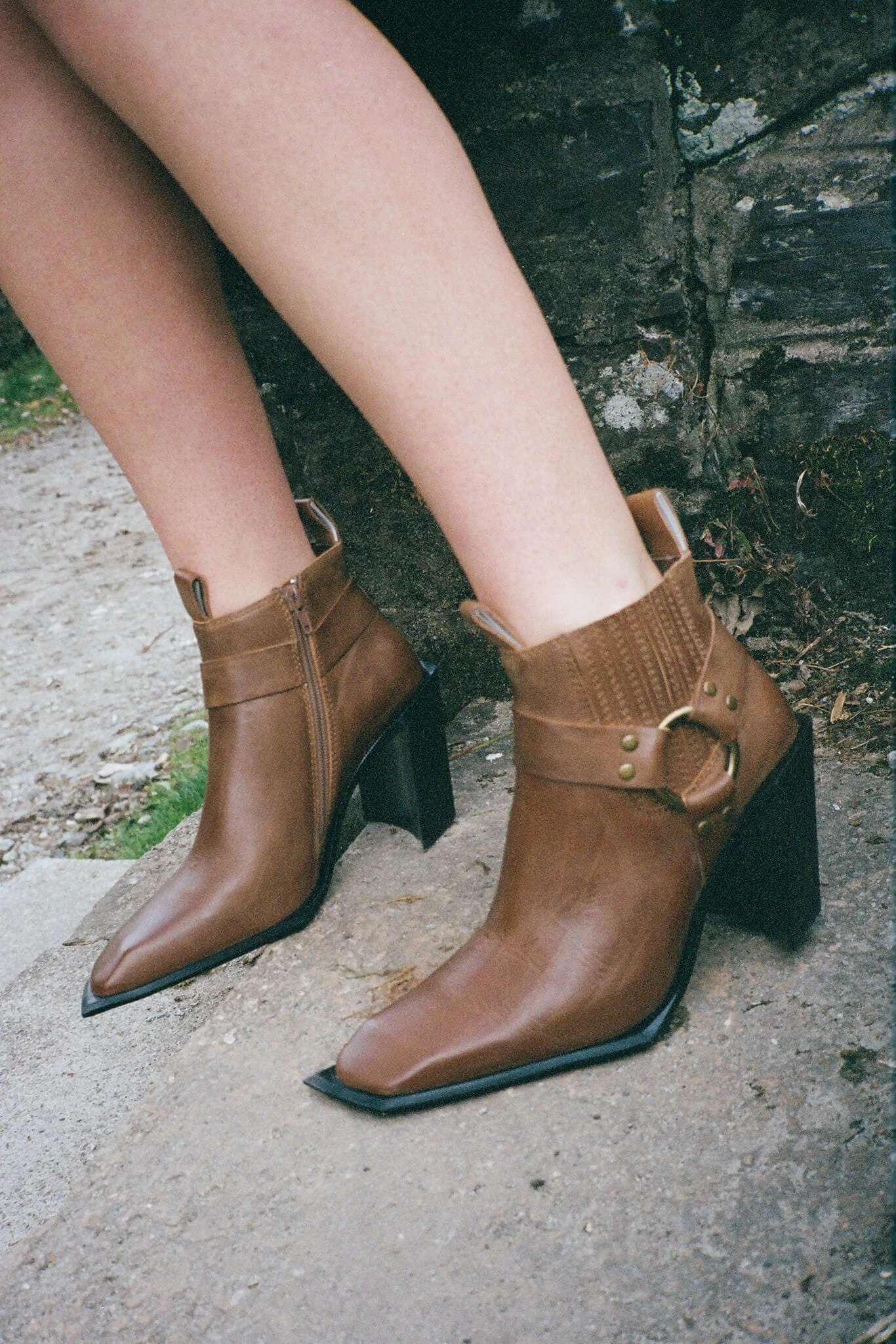 Sculpted heeled western-inspired booth with harness