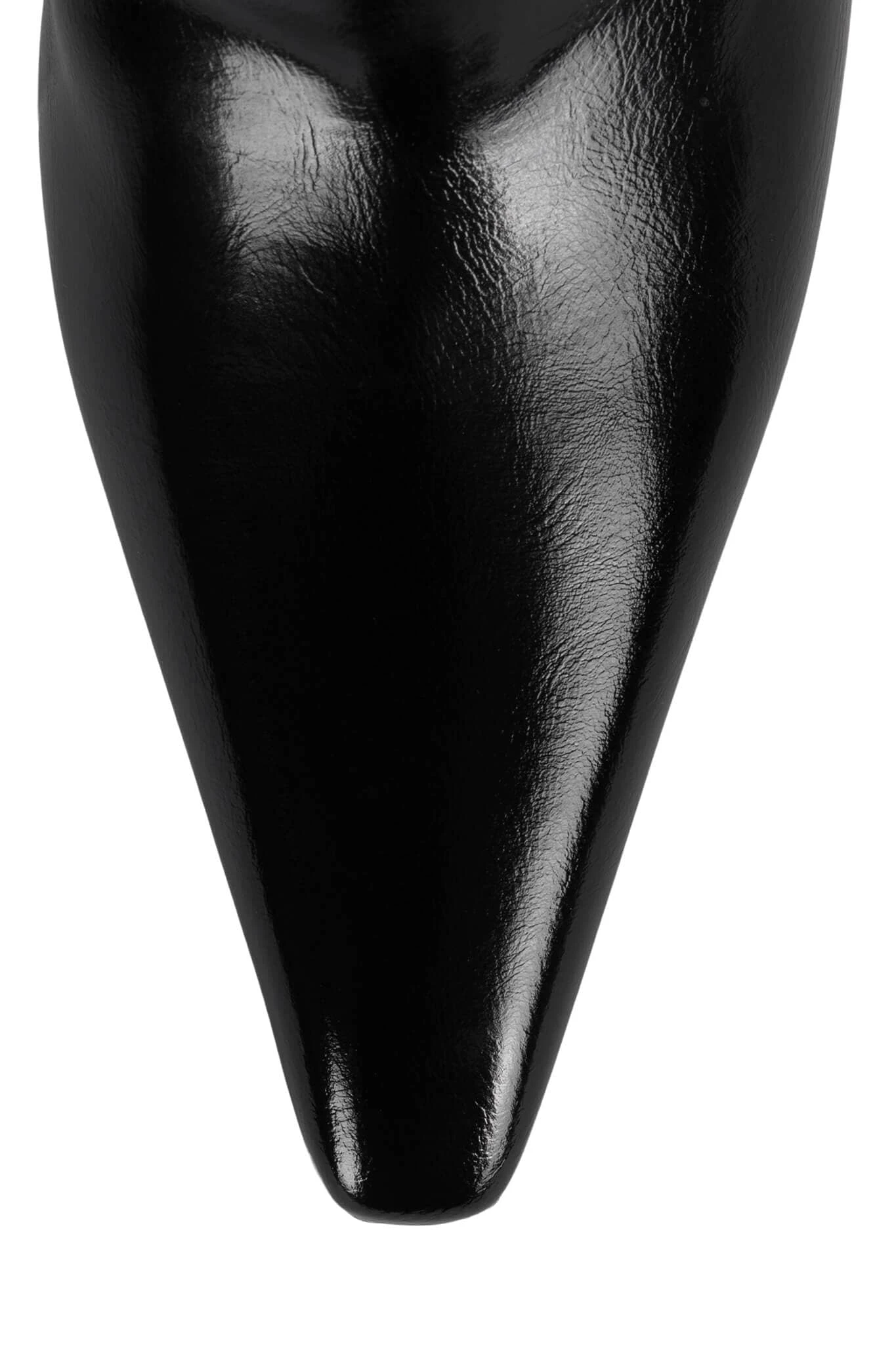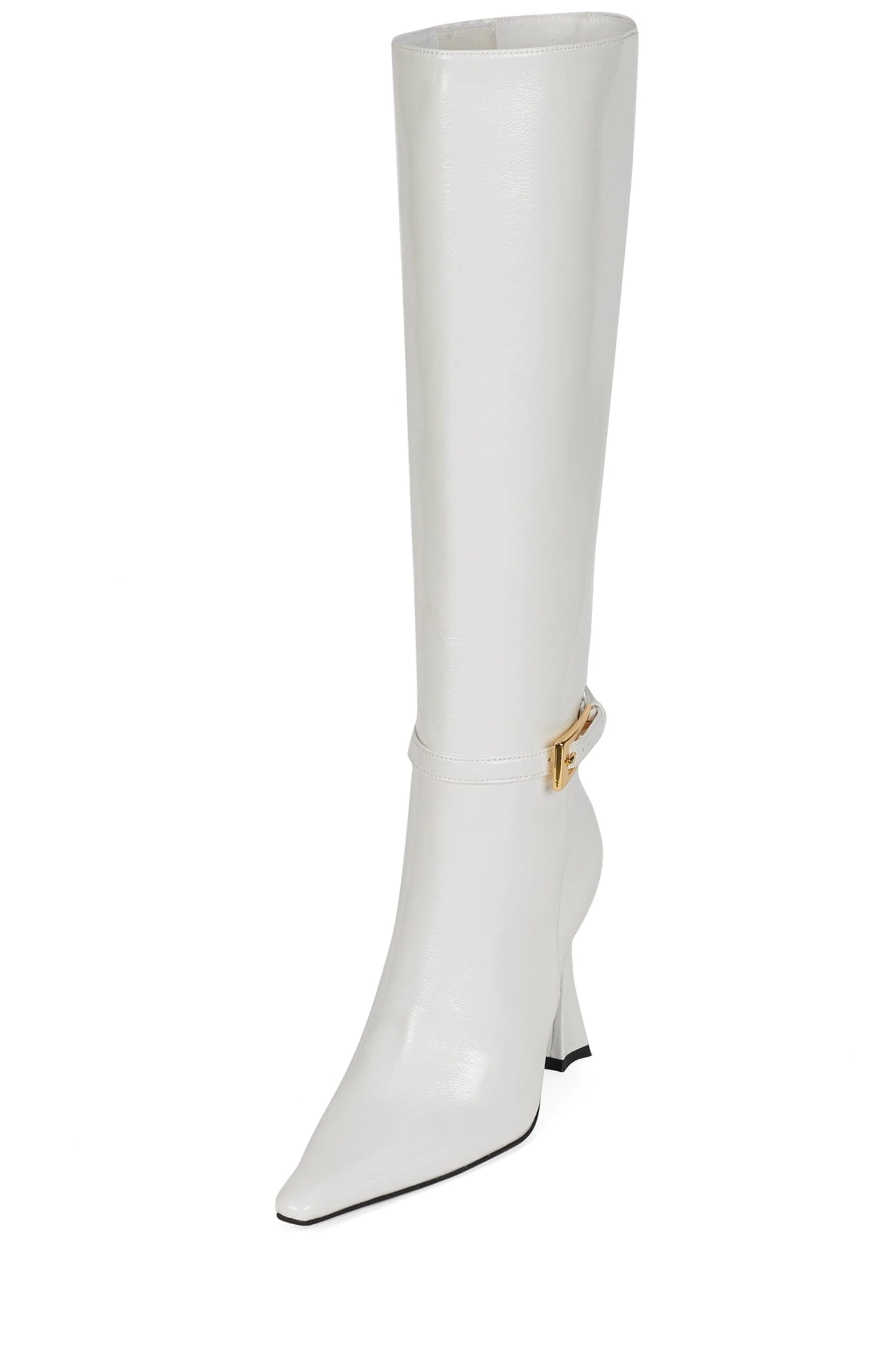Pointed-toe knee-high sculpted heel boot with sleek buckle