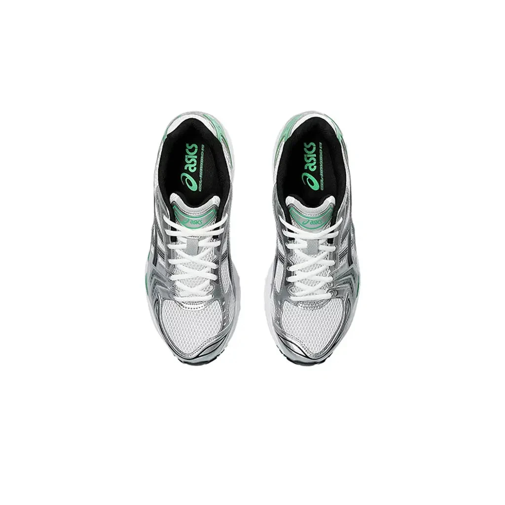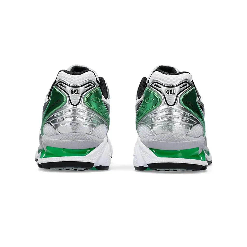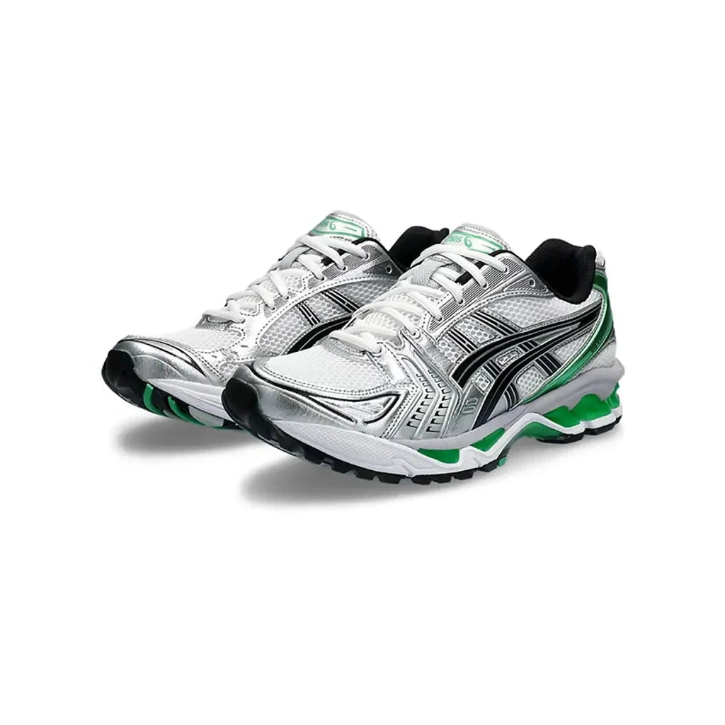 Description: ASICS supplies this fresh Gel-Kayano 14 ‘White Malachite Green’ to banner the SportStyle catalogue’s Spring ‘24 roster. Epitomising late 2000s running shoes, this progressive model remains the face of the Japanese sportswear giant’s retro selections with a flurry of all-new colourways and collaborations. True to its 2008 design, this clean ASICS Gel-Kayano 14 flaunts a white mesh upper with metallic silver leather overlays that exude a glossy texture. Black Tiger Stripes decorate the sidewalls, while metallic green accents highlight the rear panel donning a “Gel-Kayano 14” label. Visible GEL inserts bolster the foam midsole, propped up by a sturdy TRUSSTIC shank plate clad in a silver and green gradient.