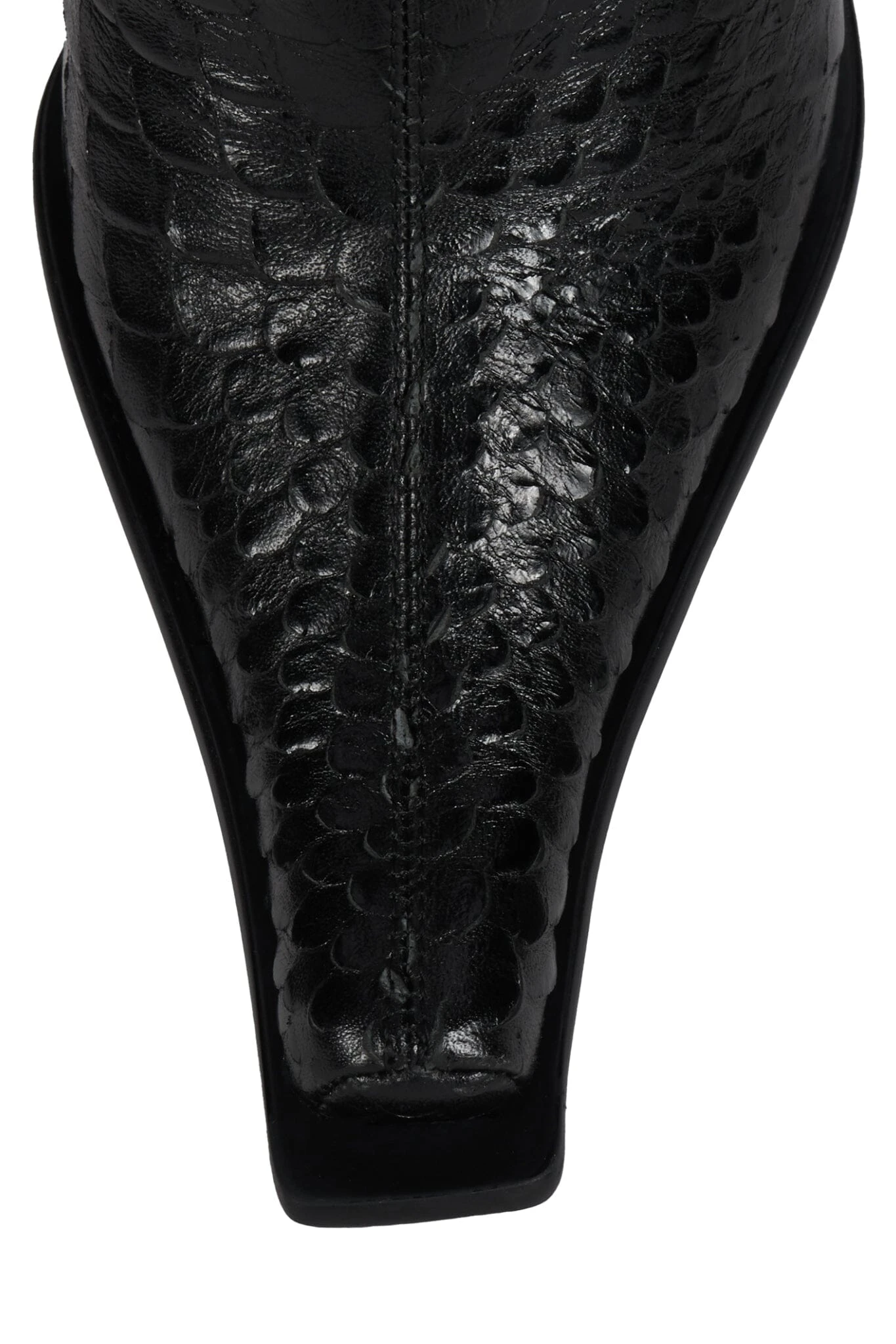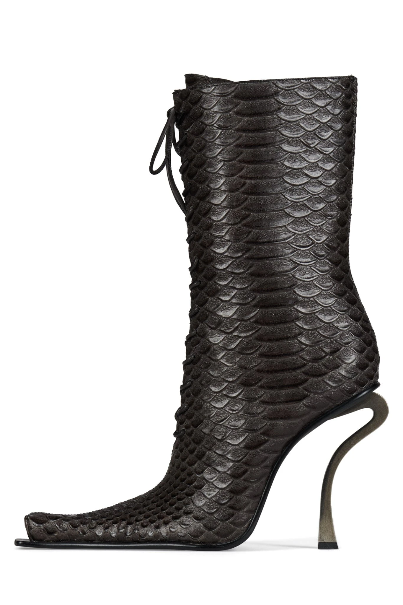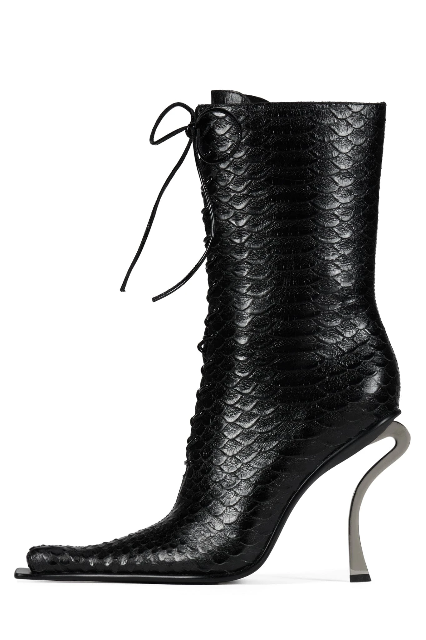 Exaggerated pointed toe lace-up boot with sculpted metal heel