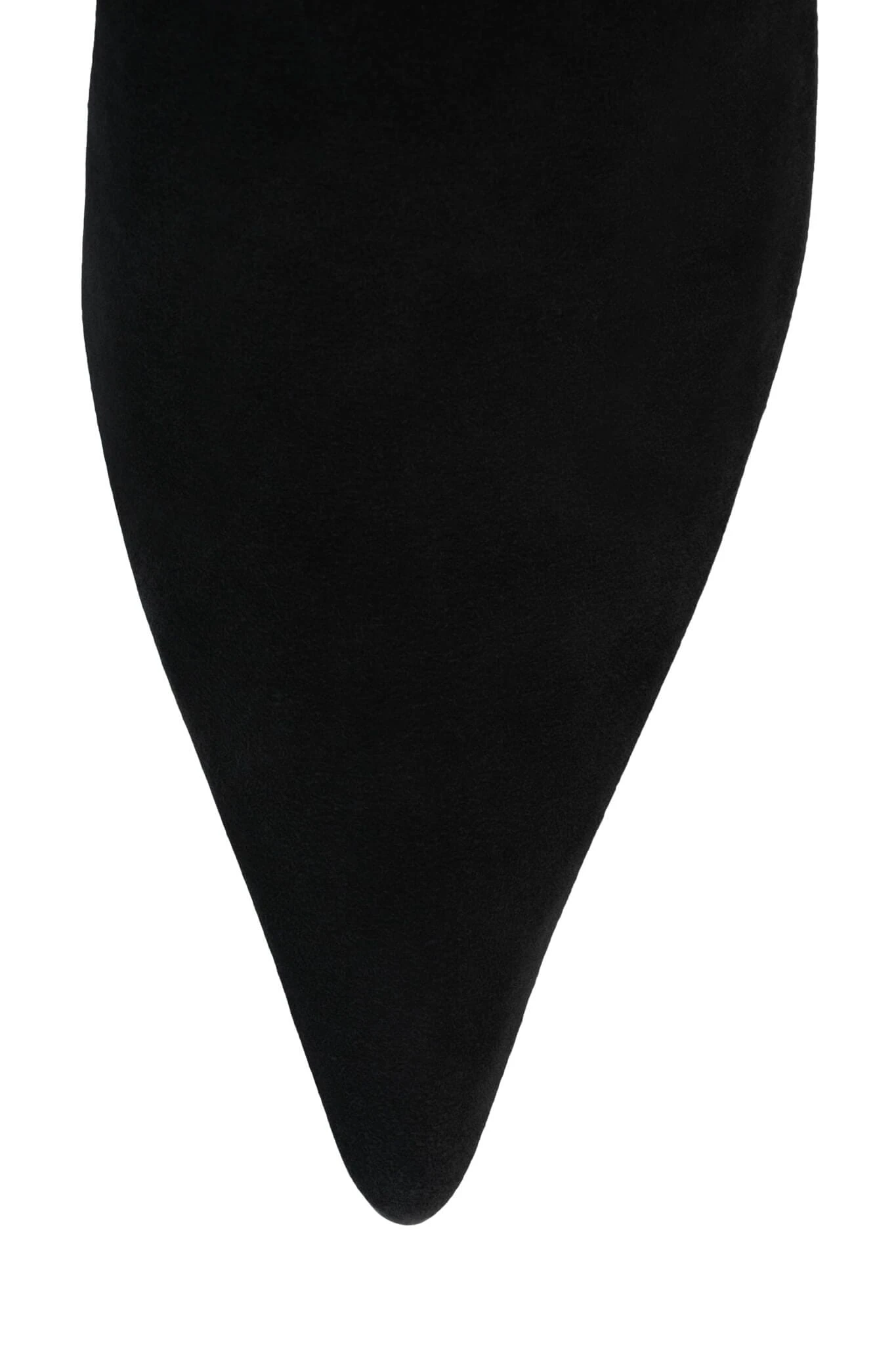 Knee-high pointed-toe heeled boot with strap and buckle detail
