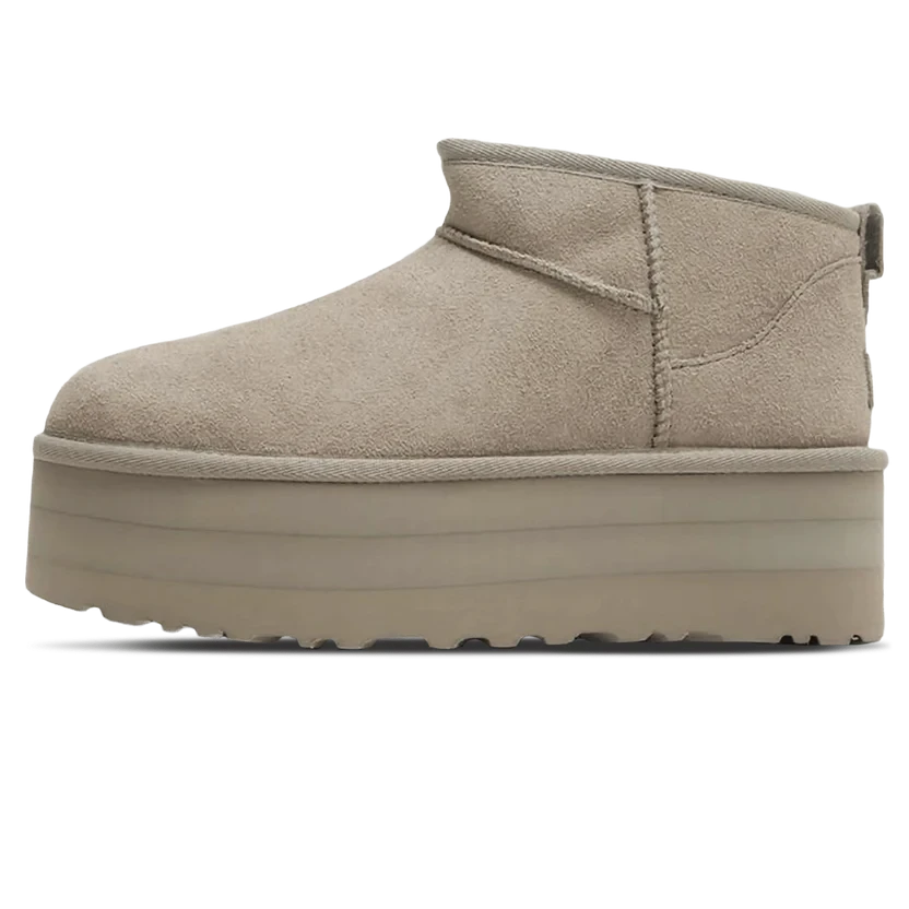 Description: UGG’s ankle-length and platform version of its Classic Boot, the Ultra Mini Platform, has a new greyish brown variation that will go with just about anything in your wardrobe. This Ultra Mini Platform has an all-suede upper with moccasin-like overlock stitching on the seams. The creamy seventeen-millimetre upcycled-wool-lyocell UGGPlush insole and lining promise the wearer warm and cosy feet.